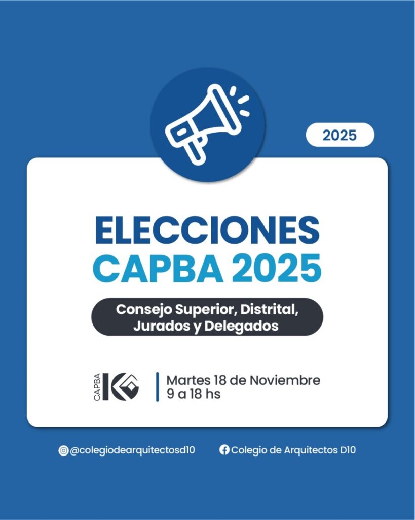 EJERCICIO PROFESIONAL ELECCIONES CAPBA 2025 XII Bienal de Arquitectura del CAPBA CS 2025 Reportaje al Arq. Luis Chirico sobre las responsabilidades del arquitecto en una obra Seminario de Postrado Experiencias Proyectuales Sostenibles ¡Se vienen las elecciones! Festejo del día del Arquitecto delegaciones de Tres Arroyos, Pigüé y Suárez Desarrollo de Techos verdes con Sustratos Sustentables y Plantas Nativas Capacitación de Alba Festejo Día del Arquitecto Charla de estrategias para inundaciones Itinerante BAU Bahía Blanca Itinerante BAU Tres Arroyos Agradecimiento Asamblea Extraordinaria Nuevos Matriculados 2024 Asamblea anual ordinaria Concurso Nacional de Ideas para el Plan Maestro Distrito Doc Central Puerto La Plata Fiestas de fin de año RECUPERACIÓN DEL BANCO NACIÓN Concurso Nacional de Ideas y Anteproyectos “PLAN DE BARRIO CENTRO”, hacia una Centralidad Metropolitana de la Ciudad de Córdoba 2024 CONVOCATORIA ASAMBLEA EXTRAORDINARIA CAPBA10 Mirá los proyectos premiados Capacitación Vasser Griferías Estamos diseñando un NUEVO CÓDIGO URBANO para Bahía Categorías de Sostenibilidad para la Formación del Pensamiento Proyectual Rowa BIOARQUITECTURA Y BIOCONSTRUCCIÓN